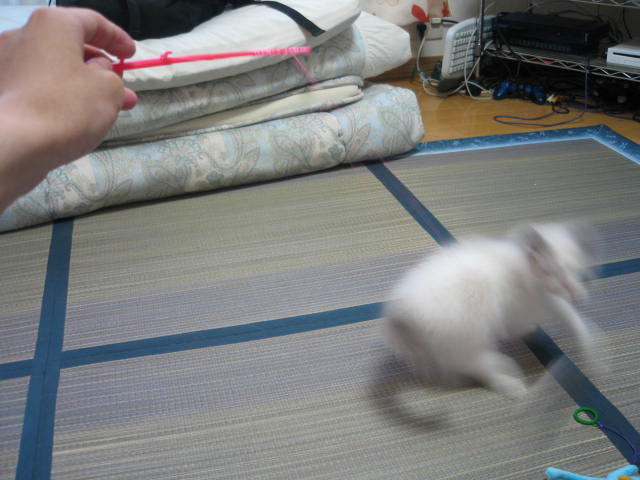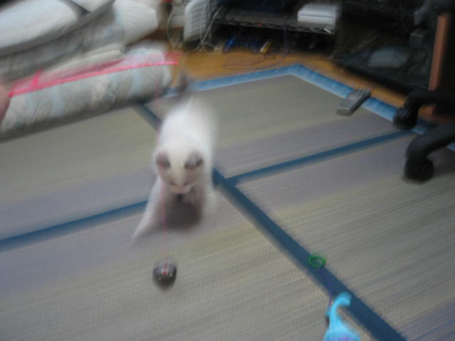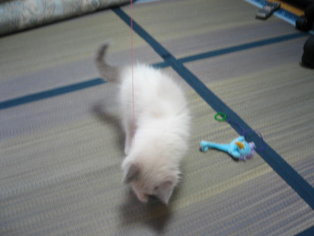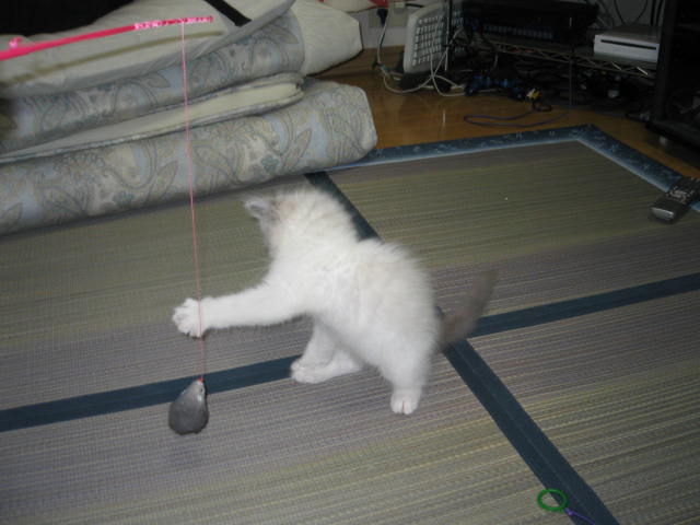 エサはおもちゃのネズミ 早速発見されましたw このお魚さん、引きが強いですw エサから離れても止むことのない攻撃 ぶれる程速いネコぱんちは必見ですw 本日のベストショット 襲いかかる寸前です よく自分でも撮れたなと思ってしまいます^^; 追記:現在のポン太さん 人のかばんを布団にw …もうどうだっていいやw